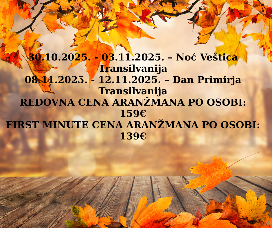 (Transilvanija Putovanje 2025 Drakulin Dvorac – Dvorac Grofa Drakule) – Doručak. Napuštanje hotela. Polazak u 12h ka gradu Sibiu. Razgledanje starog gradskog jezgra Sibiua, koji nosi tradicionalni epitet „muzej na otvorenom“: Veliki trg – Palata Brukental i rimokatolička, jezuitska crkva; Mali trg sa Savetnom kulom; Trg Huet sa evangelističkom katedralnom crkvom iz XIV veka; Ulica Mitropolije, u kojoj se nalazi saborna crkva Erdeljske mitropolije… Slobodno vreme. U popodnevnim časovima polazak za Beograd oko 19h.