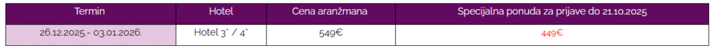 – Organizator zadržava pravo da putem PROMOCIJA i LAST MINUTE ponuda proda svoje slobodne kapacitete po cenama koje su drugačije od onih u cenovniku. Stranke koje su uplatile aranžman po cenama objavljenim u redovnom cenovniku nemaju pravo da potražuju nadoknadu na ime razlike u ceni.